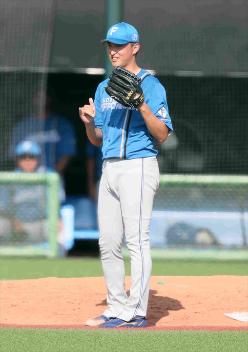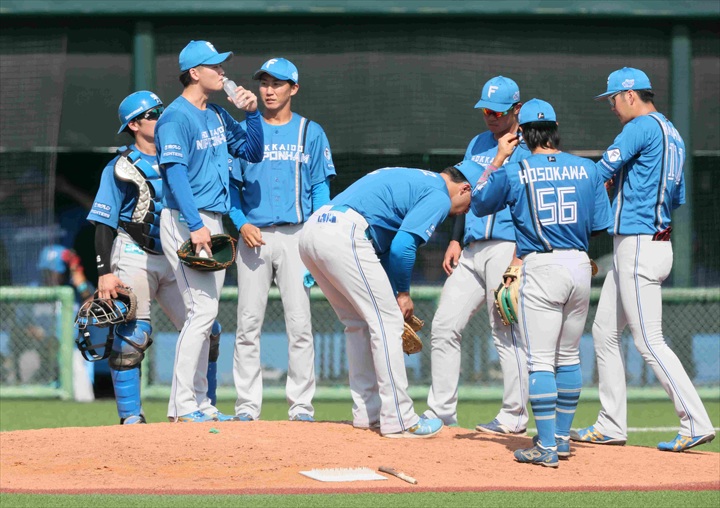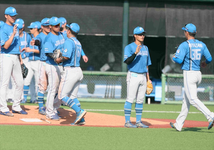 ■4回裏 F 3−0 Ys 投手交代 P北浦→松岡93 武岡 ストレートの四球 R1 鈴木叶 SSゴロ 6−4−3Wプレー 澤井 CF前ヒット R1 松本直 R盗塁成功 R2 ストレートの四球がワイルドピッチで R1・3 浦野コーチマウンドへ 西村 空振り三振 (松岡20球)