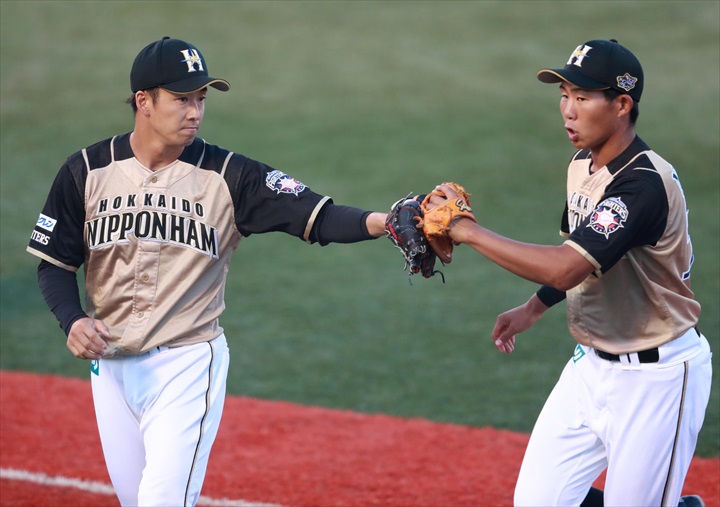 【写真1】先発 斎藤佑投手 【写真2】2回裏終わって:斎藤佑投手&難波選手 【写真3】5回表:清宮選手タイムリー2ベース 【写真4】6回表:淺間選手投タイムリー3ベース