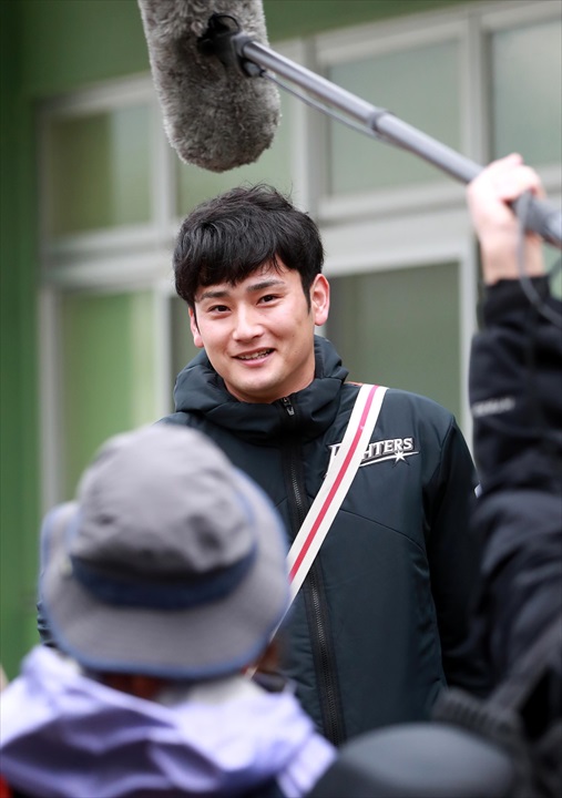 【写真4】朝の入りインタビューを受ける中村勝投手