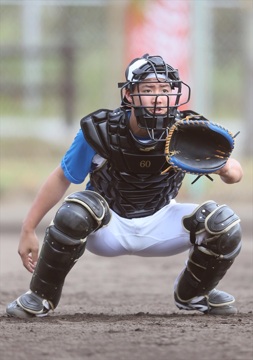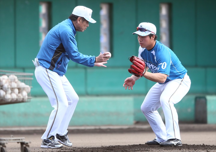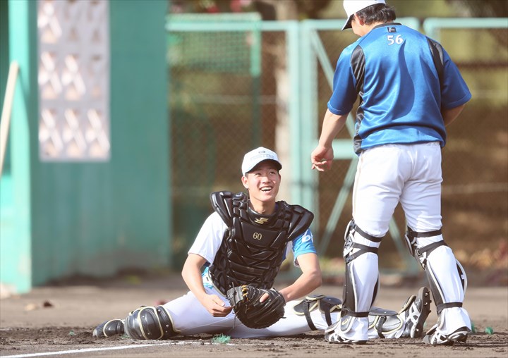【写真2】3塁からの捕球練習で、それブロックしてるだろうと市川選手に言われているルーキーの郡選手