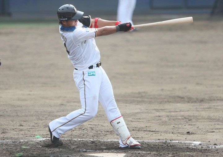 【写真1】先発 上沢投手 【写真2】4回表:宇佐美選手レフトオーバーのタイムリー(あと数センチ上でHR) 【写真3】6回表:石川亮選手2点タイムリー 【写真4】8回表:淺間選手ライト前タイムリー