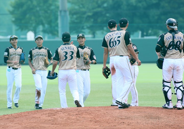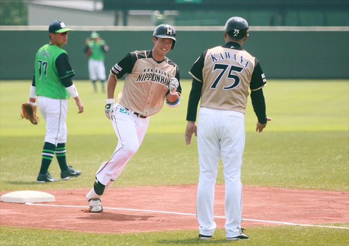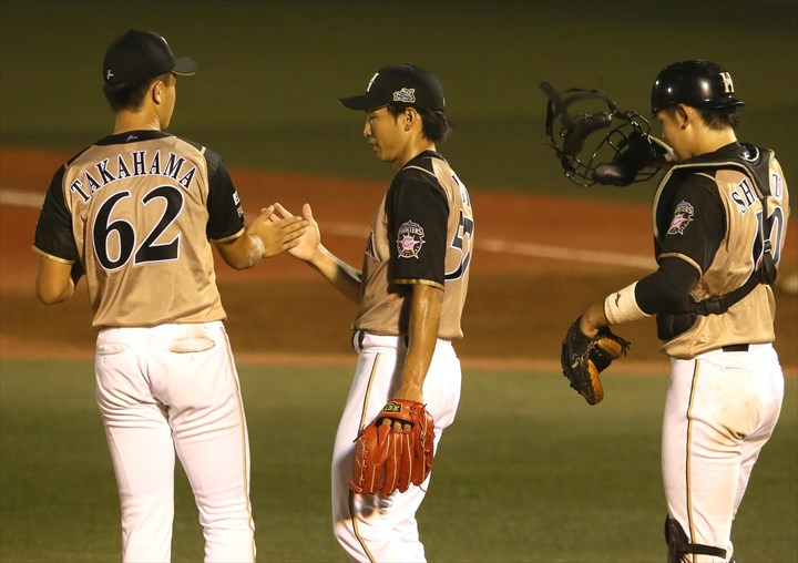 【写真1】先発 上沢投手 【写真2】上沢&清水バッテリー 【写真3】6回裏:淺間選手2ランホームラン 【写真4】9回裏:タイムリーヒットの高濱選手