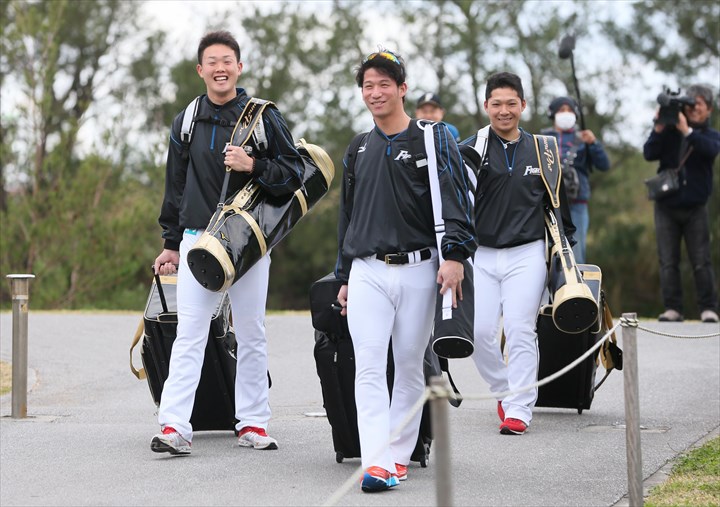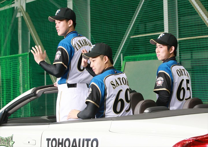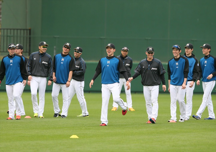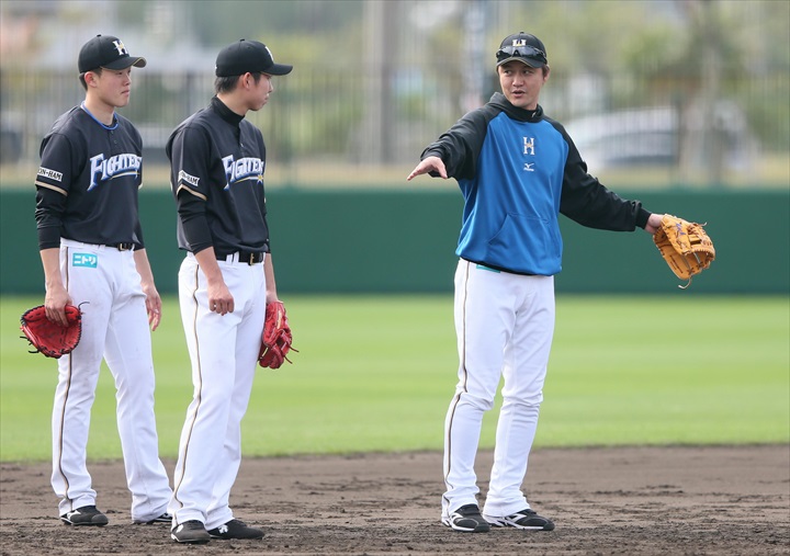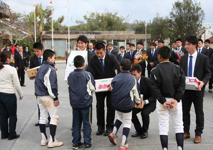 荒張選手、新垣投手、森本選手、屋宜投手、宇佐美選手