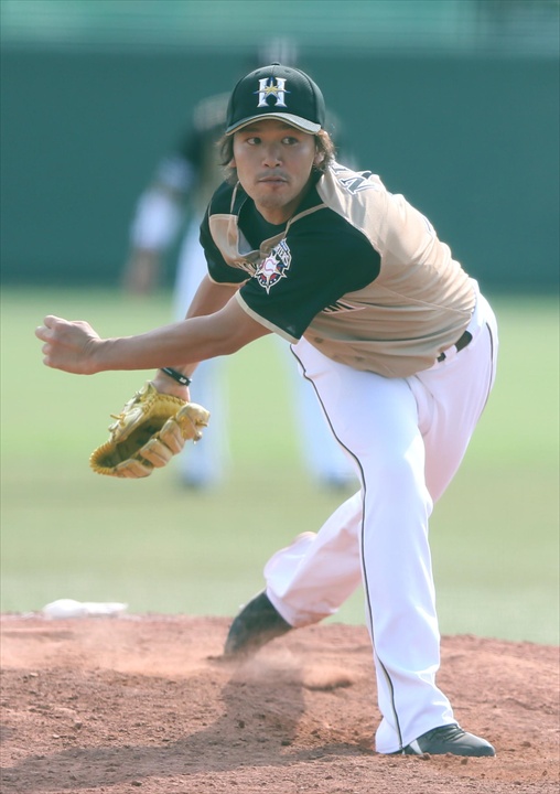 【写真1】先発 新垣投手 【写真2】2回裏 村田選手ライト前ヒット 【写真3】3回裏 金子選手センター前に落ちるヒット 【写真4】5回裏 石川亮選手センターオーバー2ベースヒット