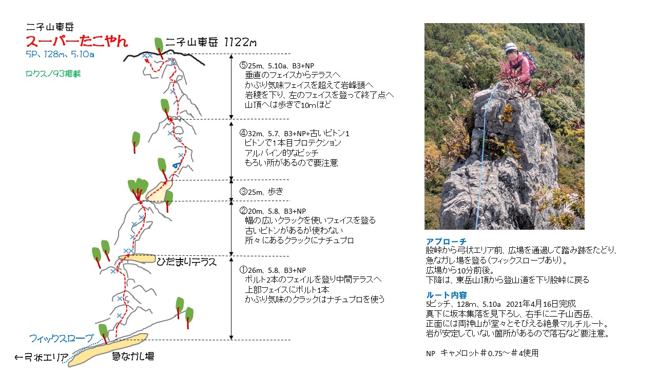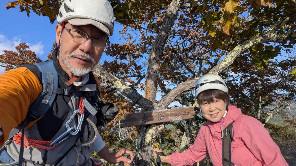 コース: 平塚自宅5:50⇒厚木IC⇒花園IC⇒皆野寄居有料道路⇒二子山倉尾登山口Ⓟ(トイレあり)10:10→10:16股峠→10:55スーパーたこやん取付き11:12→14:11登攀終了点(休憩)→14:39東岳→15:16股峠→15:48中央陵取付き→股峠→16:20倉尾登山口Ⓟ⇒道の駅両神(車中泊)
