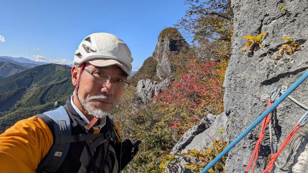 5P目 5.10a 25m arashiさんリード 核心部の岩峰までは難なく登るが、岩峰の垂壁部の核心は手も足も届かなかったので、少し左側から回り込んで小さなホールドを繋いで越えた。岩峰からの下りは先が見えなかったので怖いと感じたが、側迄行って見るとしっかり足元が見えていたので、後ろ向きになって下りたらスムーズに通過できてホッ!あとはほんの少しの登りで終了点です。 ロープを解いて、ゆっくり景色を眺め、登攀後の充実感を感じながら休憩を取る。