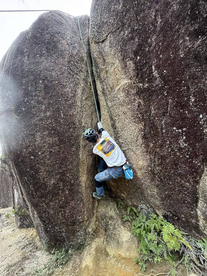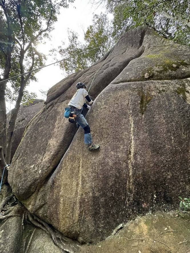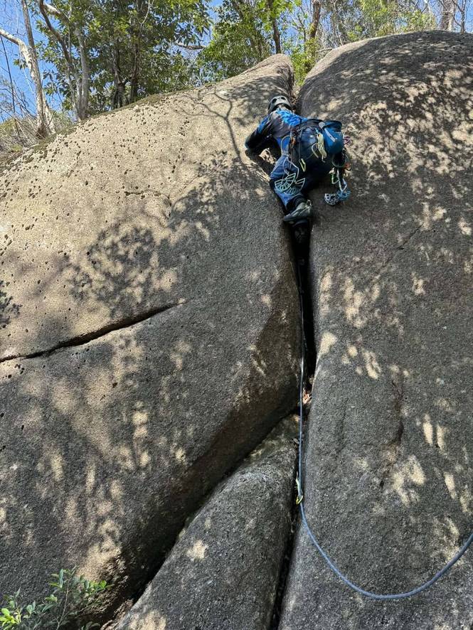 B思いやり10b 傾斜のあるクラック。なかなか離陸できなかった。コーナークラックで身体が窮屈なので、片手でジャミングしてツゥーフックで身体を支え、結晶の粒に足を置き、キョンから立ち込んでいくムーブを捻り出す。Sさん、またもや会心のオンサイト!私はビレイヤーの思いやりでなんとかトップアウトw!