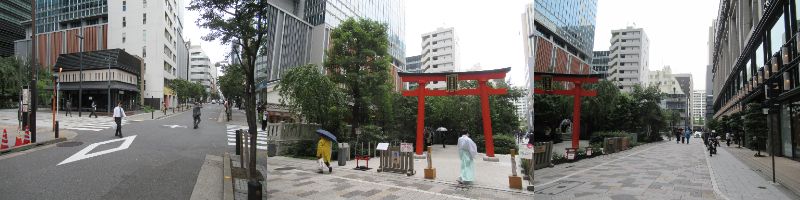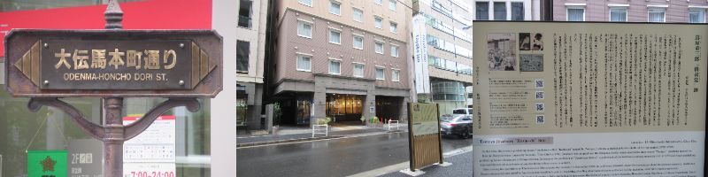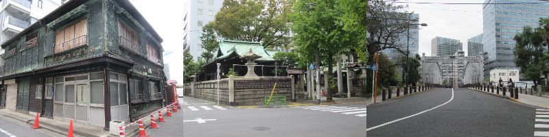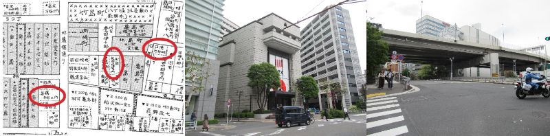 写真 やきとり宮川(飯時で行列が) 雑貨屋赤札屋 横の路地(この右側に写楽の住居) 江戸の地図(左下の丸が斎藤十郎兵衛) 証券取引所 鎧橋 江戸橋 江戸時代はこの先にあった 切絵図の下側の丸が江戸橋 (福徳神社の横まで西堀留川があった) この角を左手に 福徳神社 右側はCoredo2
