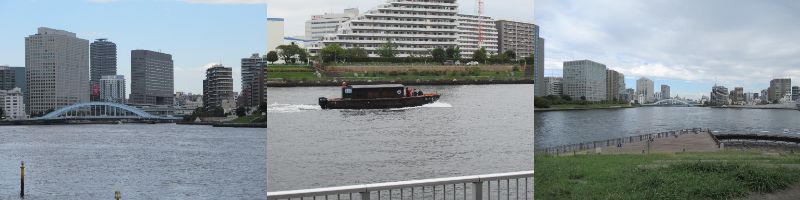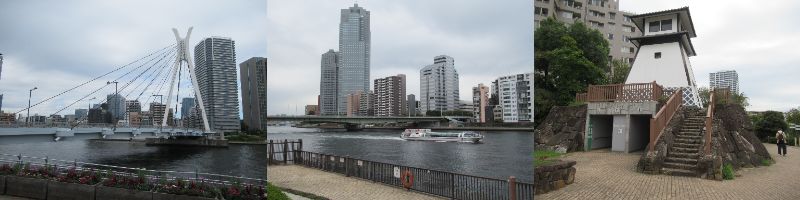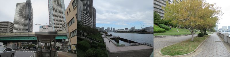 中央区の月島駅を出て 相生橋で左に折れ川岸へ