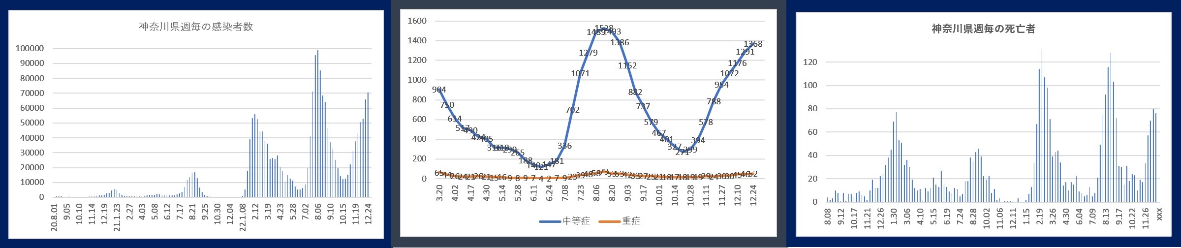 写真 神奈川県のコロナ状況 感染者 6波を超え 7波の7割に 中等症 ピークは見えません 重症者 そろそろピーク? 死亡者 ちょっとだけ下がった