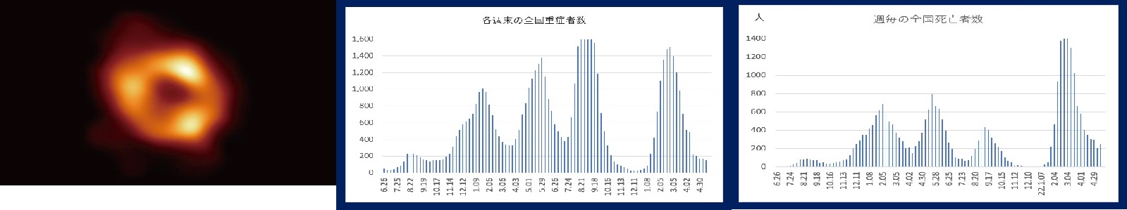 写真 我々天の川銀河のブラックホール 明るい部分が直径6000万km 太陽直径 140万km コロナの重症者 死亡者の推移 まだ底ではない