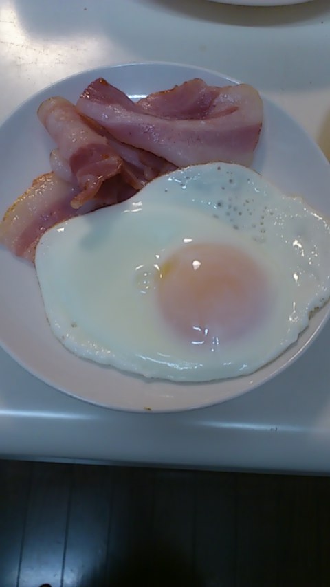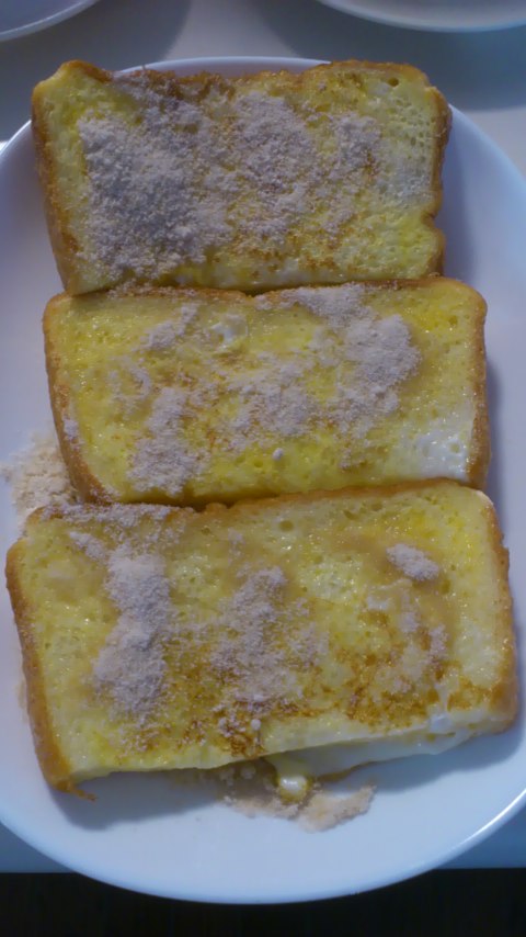 朝食にフレンチトーストを作りました。材料は牛乳、卵、きび砂糖です。牛乳と卵を混ぜ、そこに食パンを付け、弱火で焼きました。きび砂糖をかけ出来上がりです。子供の希望で、ベーコンと目玉焼きを添えました。
