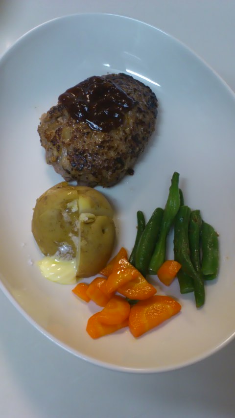子供がどうしてもハンバーグを作りたいと言うので、学校の家庭科の授業で配布されたプリントを見ながら作りました。ハンバーグは全て子供に任せ、私はインゲンとニンジンのバター炒めと、ジャガバターの付け合せ、コーンスープを作りました。今回は子供が主役でした。美味しかったです。