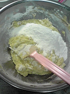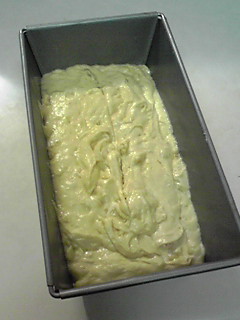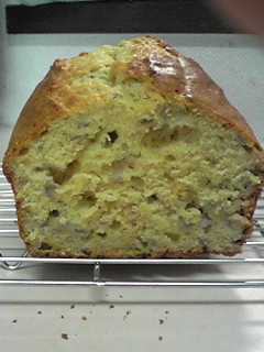 朝起きたら家族からバナナが腐りそうだから何か作ってと要望があり、朝食も食べずにバナナブレッドを作りました。材料は小麦粉150g、牛乳60cc、バナナ1本半、レモン汁少々、卵2個、重曹小さじ1/2、ベーキングパウダー小さじ1、きび砂糖80g、バター30g、ケーキ用マーガリン30gです。準備は小麦粉、重曹、ベーキングパウダーをふるい@、バナナをみじん切りにして、レモン汁をかけておきます。バターとマーガリンを良く混ぜ、そこにきび砂糖を加えA、良く混ぜます。卵を溶きAに少しずつ入れ混ぜます。そこに@とバナナを入れ混ぜます。型に流し込みナイフの先端にサラダ油を塗り切り込みを入れます。180度で30分焼き、160度で10分焼き出来上がりです。バナナの香りがして、やわらかくとてもおいしく出来ました。皆さんも挑戦してみては。