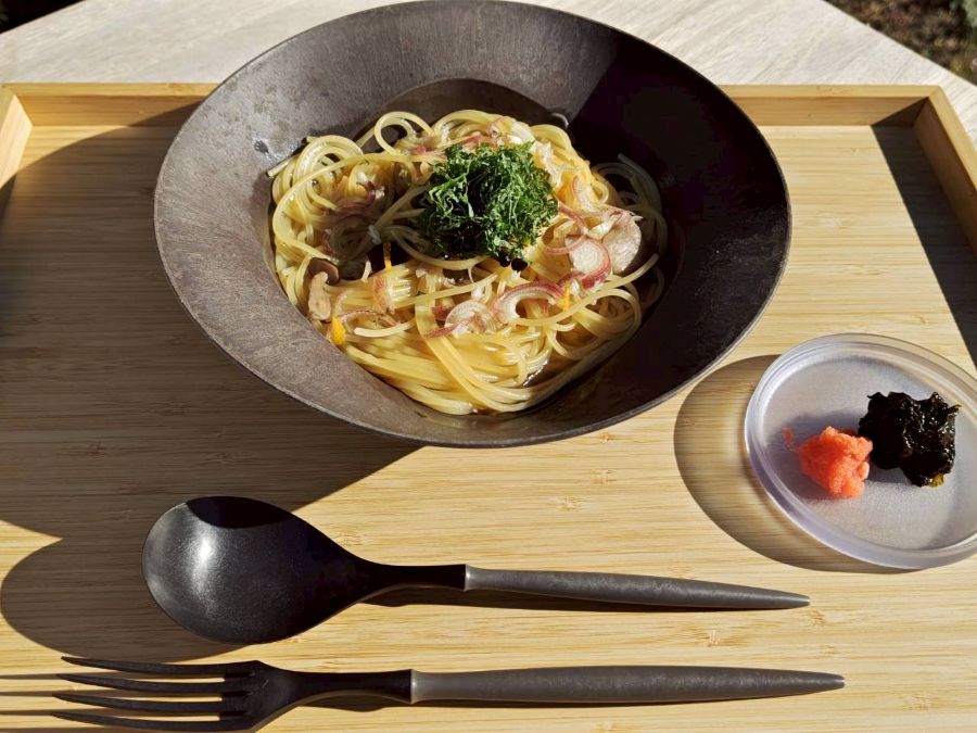 和風パスタで、お吸い物のような透明感ある