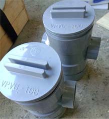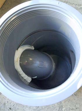 塩ビ配管に穴をあけて エンドキャップを取り付け 途中に穴をあけてエルボを取り付け。 内部には雨水が満たされるので 臭いの逆流の防止になります。