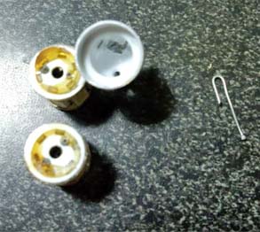 ライト本体を叩くと点灯?? 何でだろうと バルブを外すと 電極部の鋼線が抜けてしまいました。