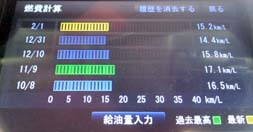 毎回、給油の度に給油量を入力すると ナビの車速パルス、衛星データ補正による 燃費が算出でき下記のように 判定がされます。
