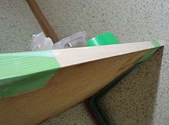 檜の薄板を木工用ボンドで 貼り付けて 養生用テープで固定。