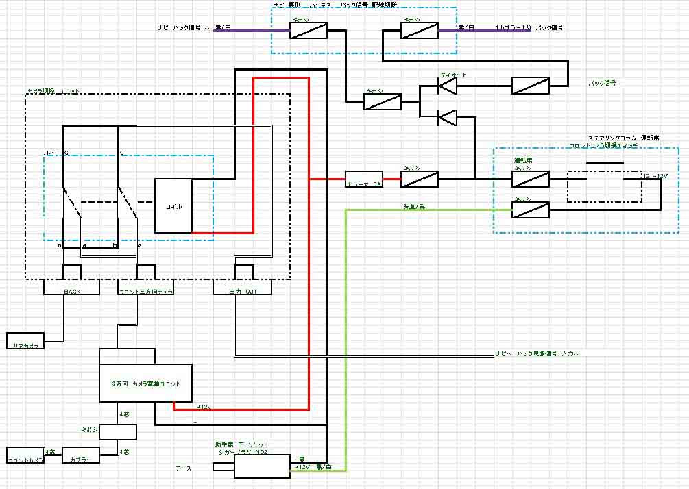 ボタンを押すと疑似バック信号でカメラの入力が切り替わり