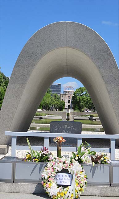 広島平和記念資料館。東館の改修工事。 (写真は原爆死没者慰霊碑からの原爆ドーム)