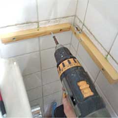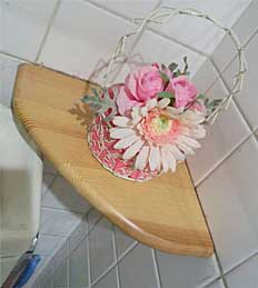 以前、コーナータンクの水洗でしたが リフォームで正面のタンクにになったので 以前のタンク取付穴を利用して コーナー棚を制作して ホットボンドで固定していました。