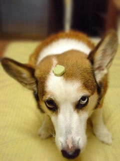 鼻先にオヤツをのせて、オヤツを宙に飛ばして「パクッ」と口でキャッチするというヤツです。