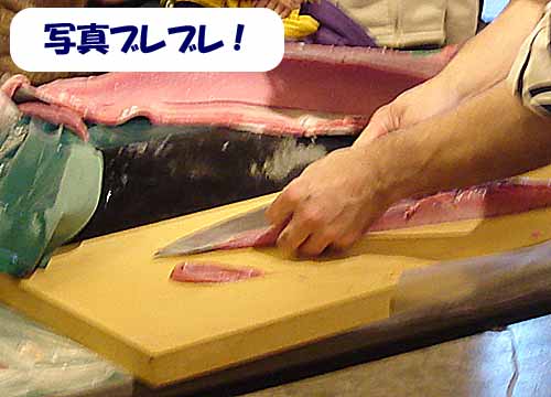 どんどん解体された鮪は当然注文すると握ってくれます。私たちは、食事が終わり会計が済んだ頃に解体が始まったので「食べれないな〜!」と思っていたのですが、ラッキーなことに、見ていた人達にも試食として振るわまれました。