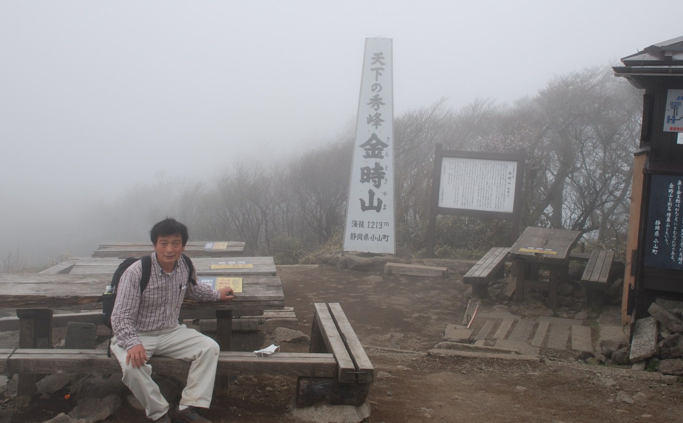 1時間10分で金時山頂(写真上)に着いた。霧で何にも見えない。