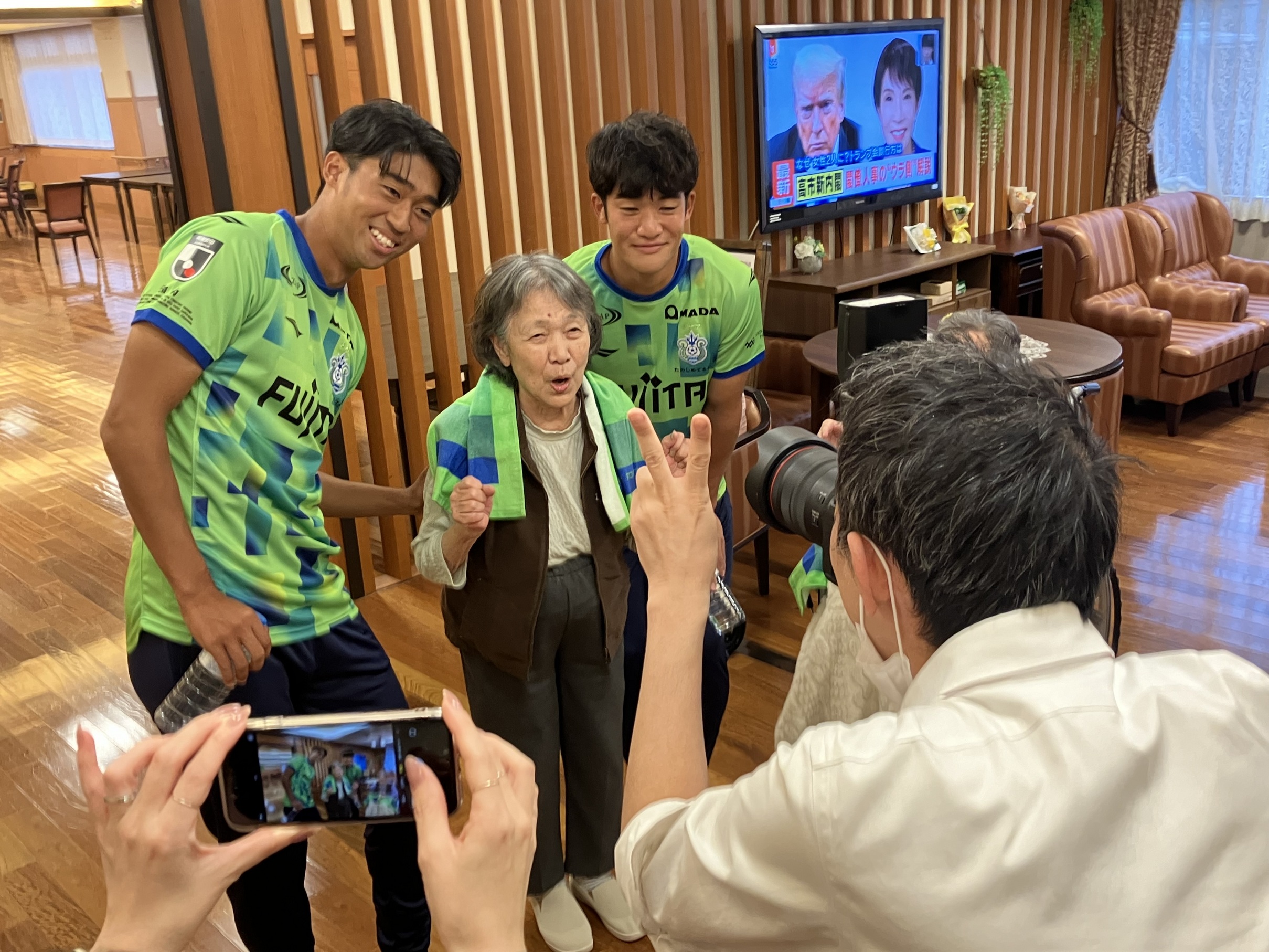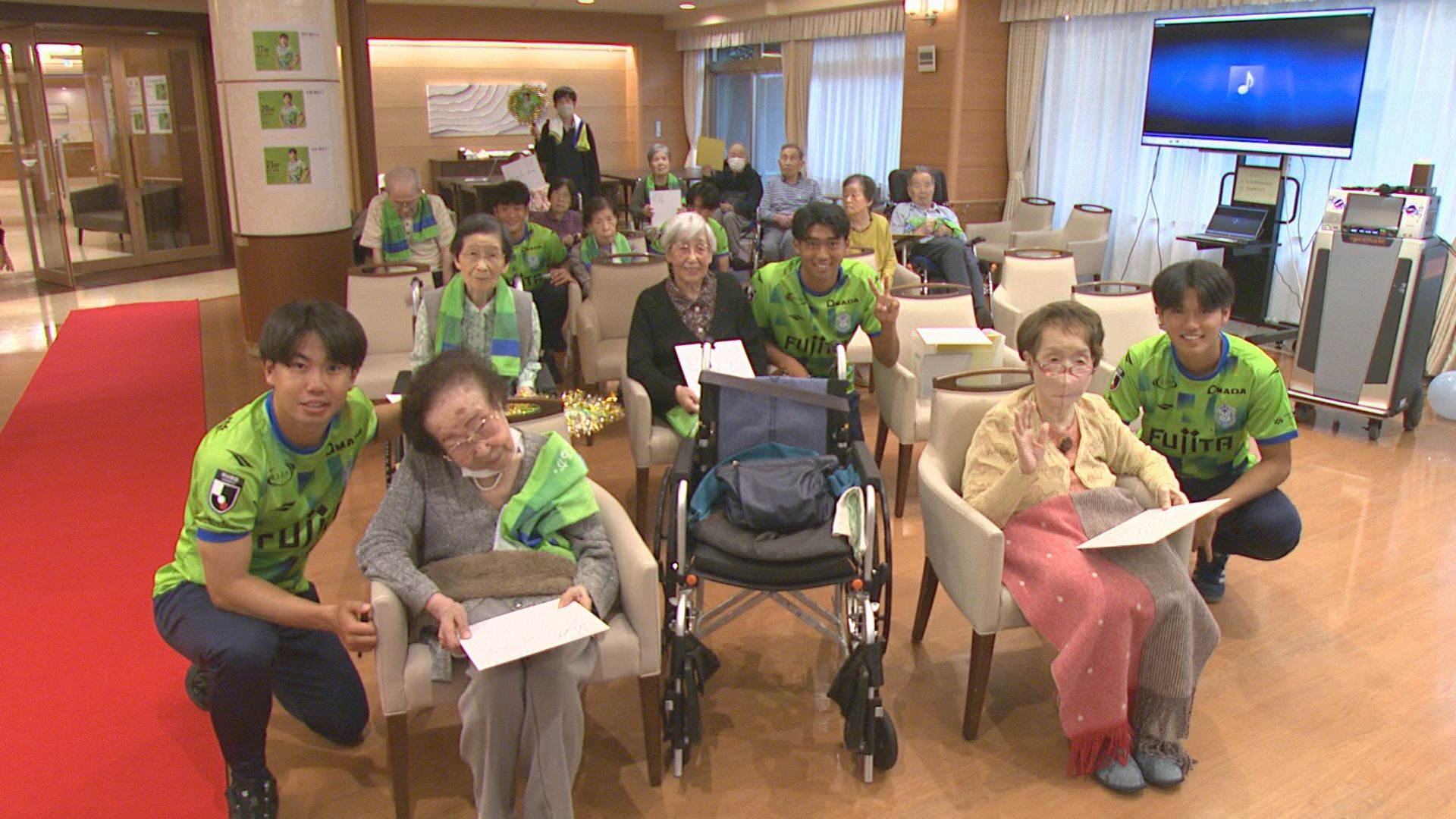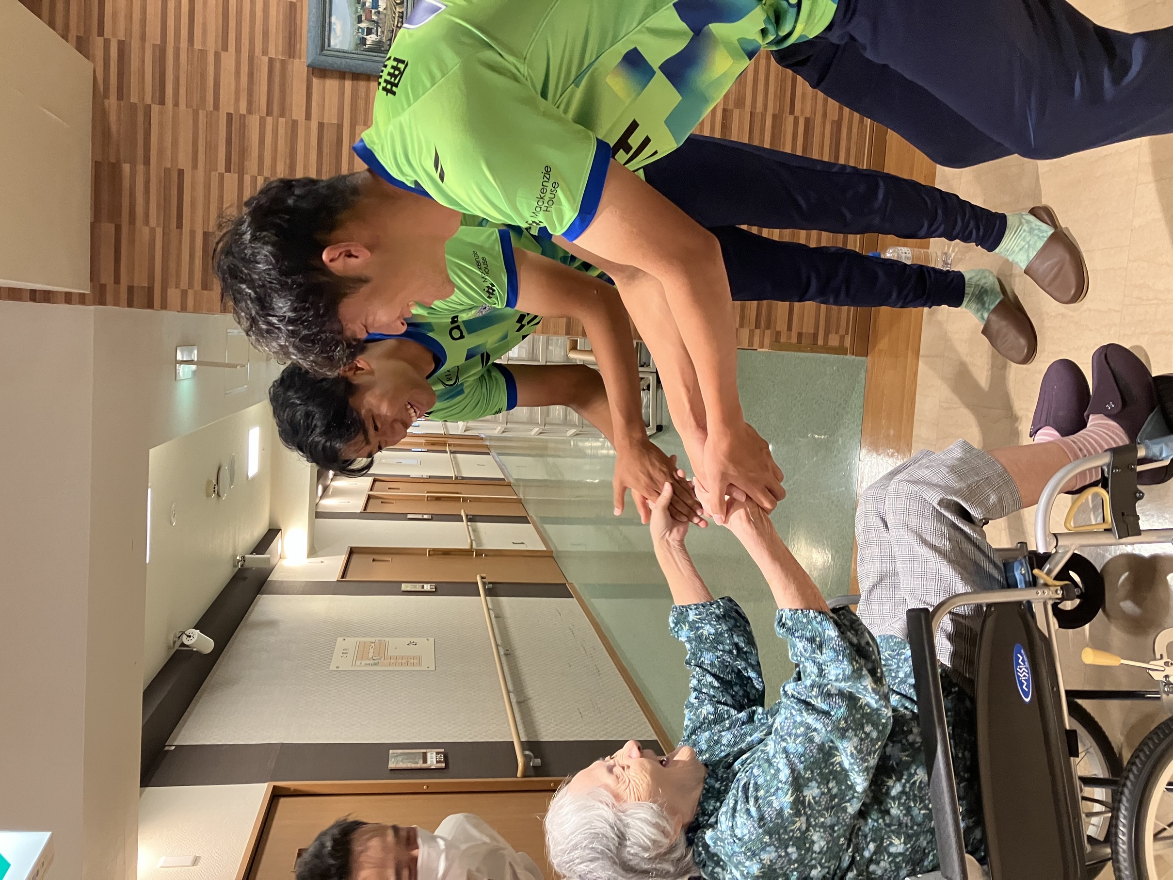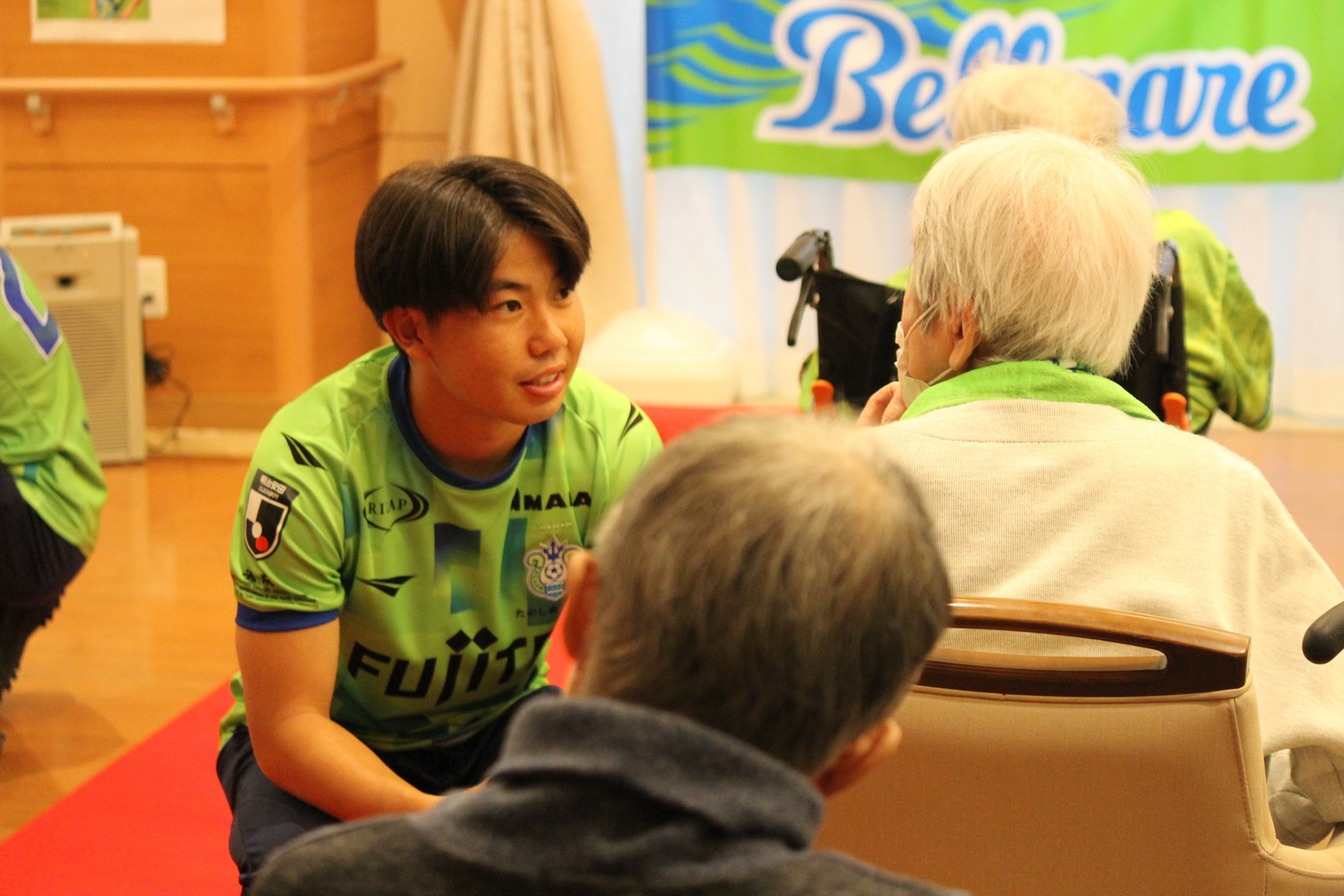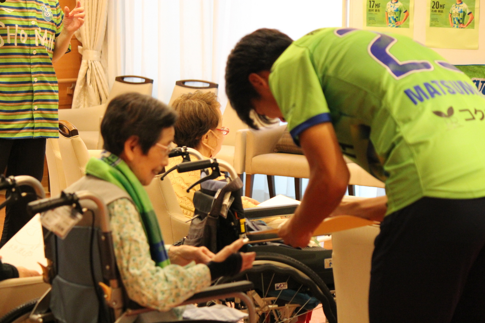 入居者の方は、選手の足の筋肉をツンツンしたり、