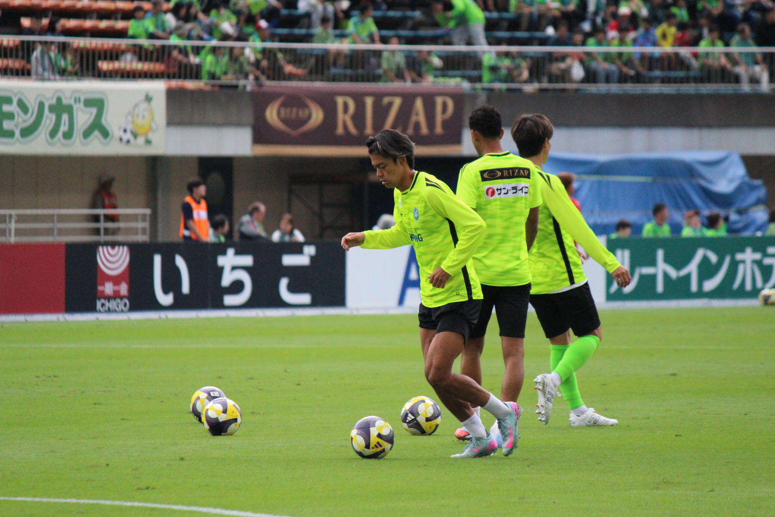 ウォーミングアップ後、サポーターを見上げる鈴木章斗選手