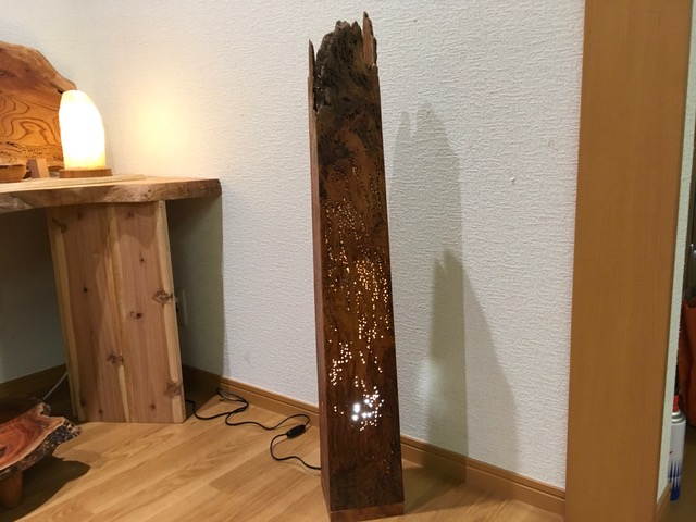 ★「ほやもく」と呼ばれるヤドリギの根のあとがある財 それを絶妙に巧く製材し、ランプシェードwpつくった