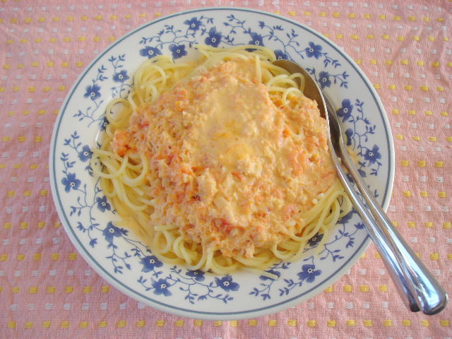 にんにくの香りとカニの旨み、生クリームの甘さとトマトの酸味がなんとも言えず合い、簡単なのになかなか美味しかったですよ^^。