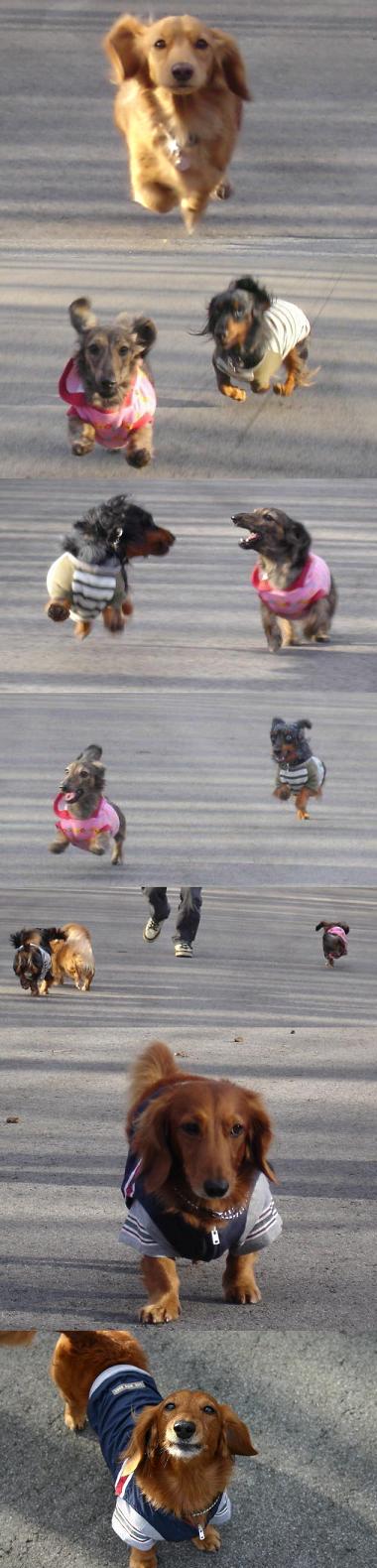 もの凄い勢いで走るひかり&まりん。マイペースに歩くはな。