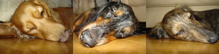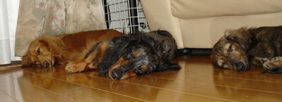 しょうがないから寝ますか・・・と3ワン揃ってお昼寝。夕方までに雨がやんで、道路が少し乾いたらお散歩に行きましょうね。