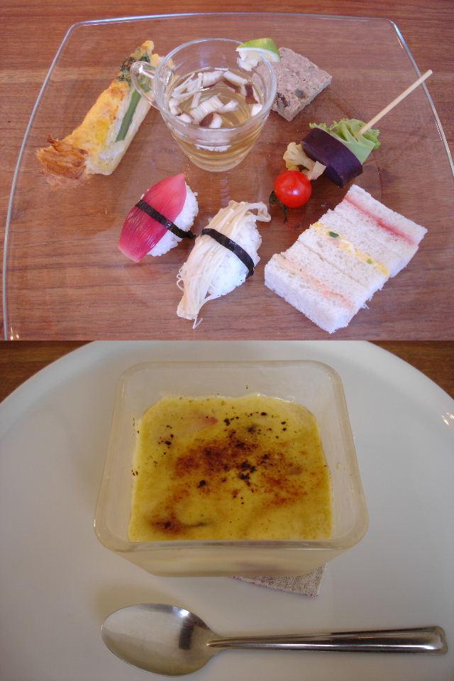 前菜は野菜のお寿司にサンドイッチ、キッシュに温野菜の串刺しなどなど、色とりどりの鮮やかなプレートでした。どれも素材の味が活かされて美味しい。