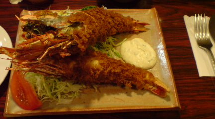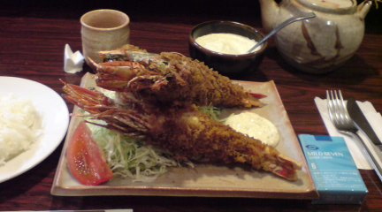 背ワタを取り、隠し包丁を入れ衣を付けて次々と揚げられていく大エビちゃんたち。