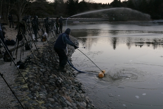 今朝は一段と冷えて池に氷が張ってしまい皆で水をかけて氷を溶かす作業をしました。
