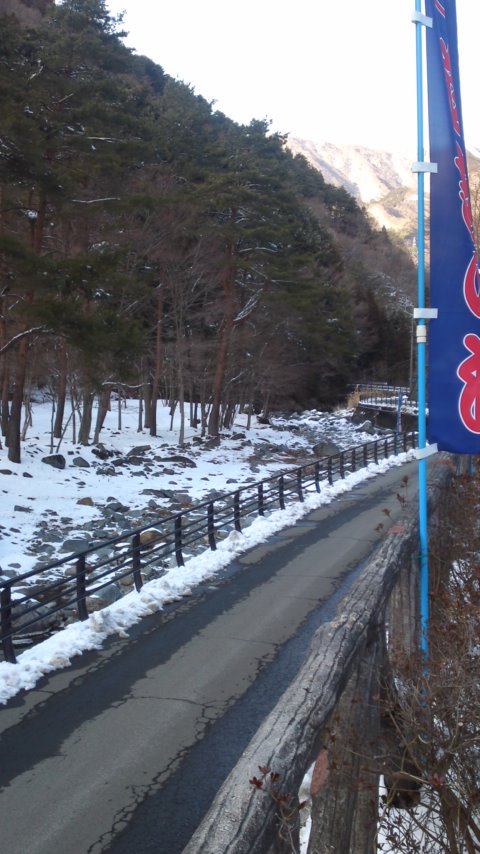 山に入ると、 雪がいっぱい残っているが、 路上はクリア。 宮が瀬を通過。