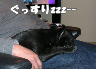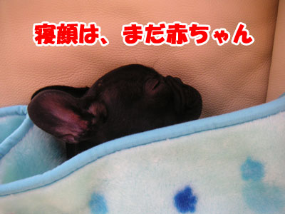 お酒が入って寝ているとうちゃんに抱かれたまま とうちゃんと同じ顔をして寝ているひゅう。