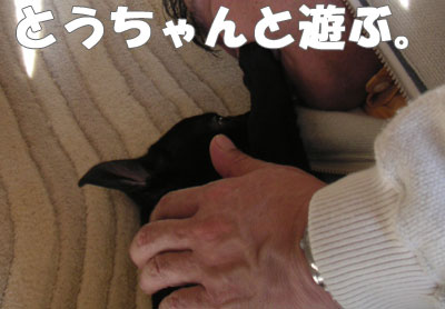 ケージから出すと一目散にとうちゃんに駆け寄る。