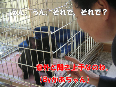 今日のひゅうは人気者で忙しかった。 午前も午後も、はじめてのお客様にごあいさつ。 お客様がみえているときのひゅうは本当におりこうさんだ。 チャイムが鳴っても、話し声が聞こえても、 物音ひとつ立てないでおとなしくしている。 ケージに近づけば、はじめてのお客様にも立ち上がり かわいく甘える。 ケージから出すとき「座れ」でおとなしくなってから出てくると 「おりこうさんねぇ、かわいいわねぇ、おとなしいわねぇ」 とほめてくださる。こんな時のひゅうは本当にかわいい♪