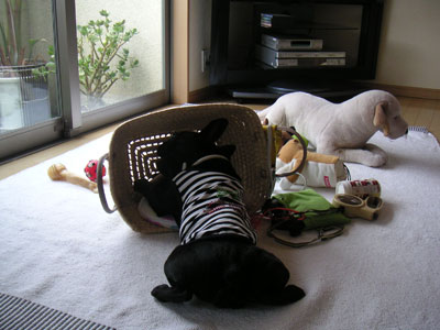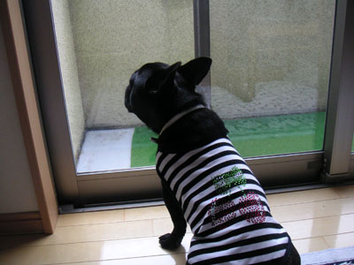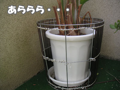 ベランダにでて、鉢植えのカバーをいたずらする。