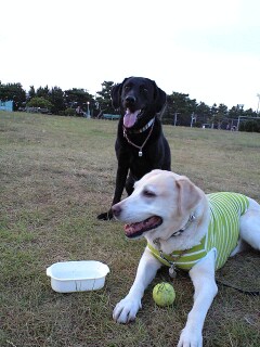 次はいい子に待っていた2匹の散歩〜〜 元気に嬉しそうに玄関を出るジェナと雫・・ でも 今日は今もだけど 蒸し暑くて・・ 気温も大して下がらず 蒸し暑い夕方・・ 涼しくなっているだろうけれど 蒸すのでちっとも涼しくない
