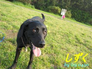 動かそうかな?とジェナのボールをすっと持って 私がのたのた走ってジェナから離れて見た くっついて来ているかな?と思って 広場の反対の端まで行って振り向いたら・・ 傍にくっついいて歩いて来たのは雫で ジェナは最初の所で座ってこっちを見ていた