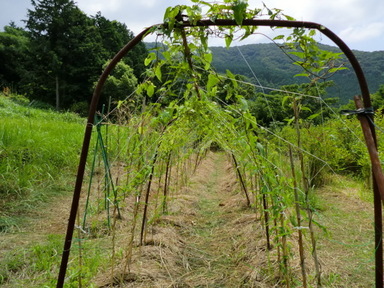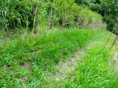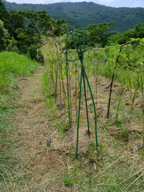 Iさんが草刈機で圃場の畝の草刈を行ってくれました。ムカゴ畝の蔓は雑草に阻まれて成長が思わしくありません。雑草を抜こうとするとムカゴまで抜けてしまいます。またムカゴごと鳥?または野ねずみに食い荒らされて芽が出てきません。この圃場でのムカゴの栽培は失敗です。自然薯はカット芋の蔓の成長のほうが1本種より活発です。