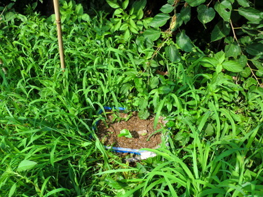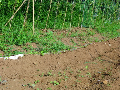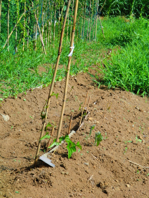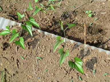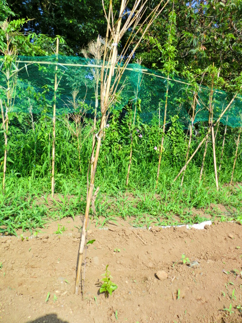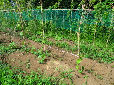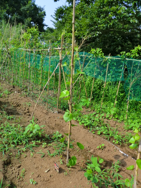 時間がないので、第二圃場は観察するだけにしました。自然薯の蔓はネット上部を超えて支柱の先にまで伸びていました。背景のムカゴ畝や雑草の緑があるため蔓の勢いの良さが目立ちませんがこちらも蔓は大きく成長しています。ただ第一圃場に比べてネット上部で蔓がとぐろを巻いている状態ではありません。約1か月遅れで定植したのでしようがありません。先週蒔いたムカゴも芽が出てきました。約200個ほどです。嬉しくなりました。また、カット芋も数本が蔓を伸ばしています。週末には支柱立てします。あきらめていたカット芋栽培容器でも3本ほど芽がでています。週末に定植します。