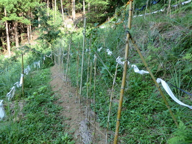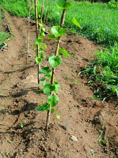 今朝は第二圃場の自然薯の草取りをしました。先日定植したカット芋の蔓が3本伸びていたので支柱を立て蔓の養生をしました。ムカゴの芽の付近の草取りもしました。