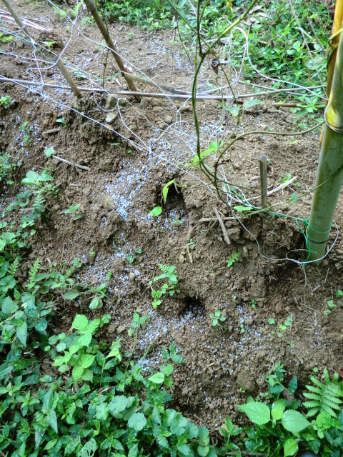 本日朝6:00に平塚を出発、08:00には伊豆河津に到着しました。真っ先に土屋圃場に向かい先週できなかった1段目の畝に肥料8−8−8を施肥しました。また、周りの雑草の草取りをしました。鹿が侵入した足跡があります。アロマフェンスを噴霧しました。まだワラビが残っています。これらは大きくなると羊歯になります。