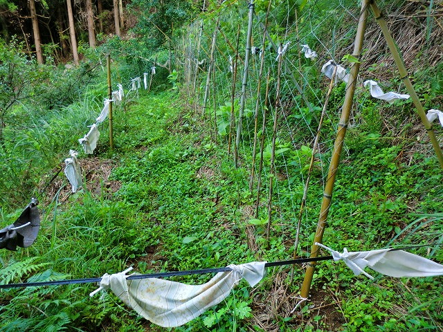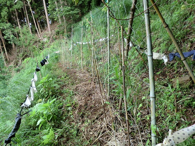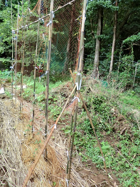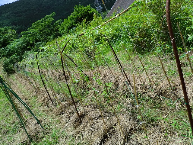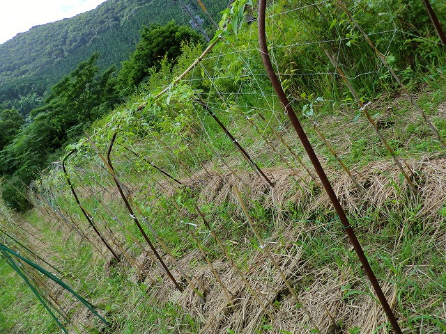 伊豆河津:上佐ヶ野のHさんの自然薯畑を見に行きました。蔓はネット上部に達しており元気よく育っていました。支柱も両端を3本にしておりネットも張ってあります。